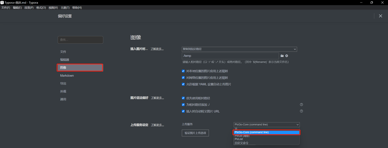 点开Typora的文件 -> 偏好设置,然后选中PicGo Core (command line)